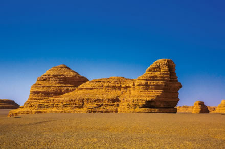 塔狀雅丹,是雅丹地貌發(fā)育壯年期的產(chǎn)物。由于風(fēng)吹、雨淋、水沖,大型雅丹體被侵蝕,沿裂隙不斷崩塌而逐漸變小,形成了如雄獅伏臥的景觀。它似乎在注視和迎接著遠(yuǎn)道而來的游客。