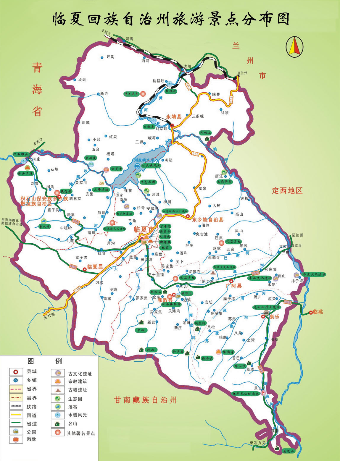 永靖縣 面積1864平方千米,人口20.90萬,政府駐劉家峽鎮(zhèn),下轄10個鎮(zhèn),7個鄉(xiāng)