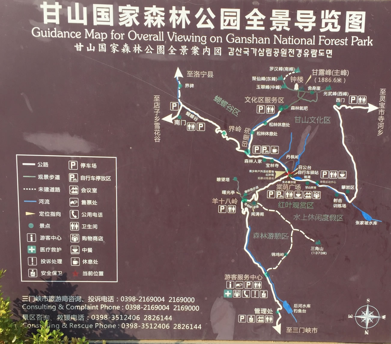 河南甘山國家森林公園,位于三門峽市區(qū)南20公里,地處豫、秦、晉三省交界處。始建于1999年,總規(guī)劃面積7860公頃,已開發(fā)了水上游樂區(qū)、森林游憩區(qū)、紅葉觀賞區(qū)、蝴蝶谷景區(qū)、甘山文化區(qū)五個景區(qū)。