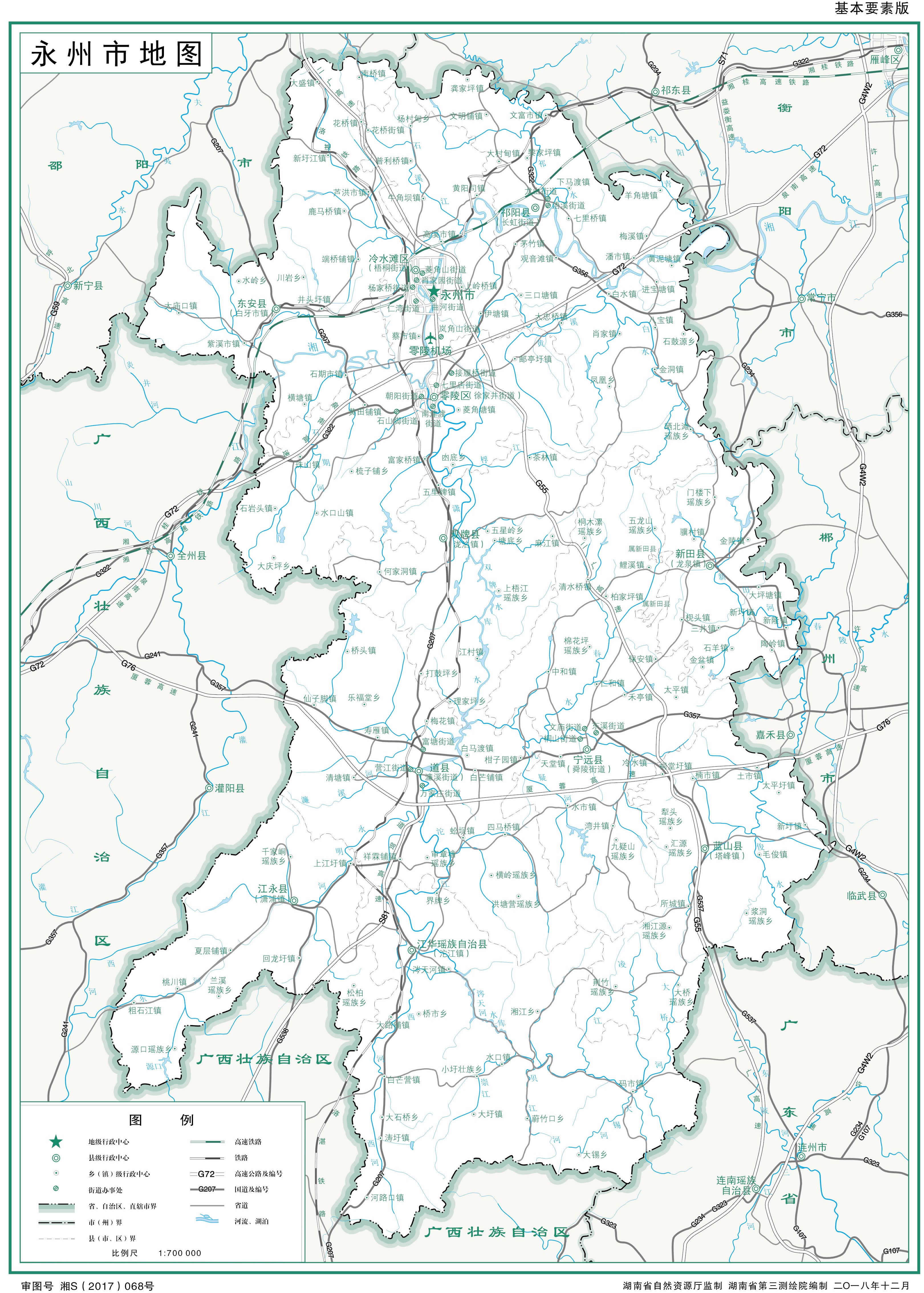 永州東連郴州市,南界廣東省清遠市、廣西壯族自治區(qū)賀州市,西接廣西壯族自治區(qū)桂林市,北鄰衡陽市、邵陽市。湘江經(jīng)西向東穿越零祁盆地,瀟水自南至北縱貫全境,南北相距最長245千米,東西相間最寬144千米,土地總面積2.24萬平方千米。
