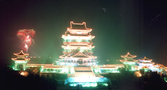 由一級高臺拾級而上,即達(dá)二級高臺(象征城墻的臺座)。這兩級高臺共有89級臺階,而新閣恰于1989年落成開放。二級高臺的墻體及地坪,均為江西峽江縣所產(chǎn)花崗石。高臺的四周,為按宋代式樣打鑿而成的花崗石欄桿,古樸厚重,與瑰麗的主閣形成鮮明的對比。