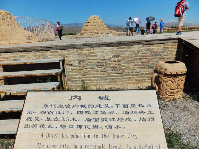 月城北側(cè)為內(nèi)城遺址,四面用神墻環(huán)繞,呈南北長(zhǎng)方形,南北長(zhǎng)180米,東西寬160米。占地約40畝。神墻中部較窄,靠近轉(zhuǎn)角漸寬大,純凈黃土分段夯筑而成,中部每段約3米,殘高約3米,比較平齊,各段如須彌座形狀。神墻四處轉(zhuǎn)角皆很高大,類圓柱形,從各轉(zhuǎn)角往神墻兩側(cè),連體圓柱愈來(lái)愈矮小,各有5個(gè),共40個(gè)。其殘存最高達(dá)6米以上,最低的3米,發(fā)現(xiàn)在轉(zhuǎn)角處5個(gè)連體圓柱夯土臺(tái)周圍皆有磚瓦殘存。內(nèi)城四面神墻皆正中辟門,門址寬約12米,地面散布瓦片、脊飾殘塊等。根據(jù)統(tǒng)計(jì),內(nèi)城坍塌墻體在2002年時(shí)已達(dá)189.1米,約占?jí)w總長(zhǎng)度的27.8%。南神門內(nèi)約25米偏西處有一處獻(xiàn)殿遺址。根據(jù)考古發(fā)掘情況看,可能原為一正方形臺(tái)基,臺(tái)面周長(zhǎng)65米,直徑約20米,堆積厚約1米。臺(tái)基以純凈黃土墊起,其上及周圍殘存大量青磚灰瓦及琉璃構(gòu)件。獻(xiàn)殿之后約6米為墓道封土,南北長(zhǎng)約42米,呈東南——西北走向,形似魚脊,以砂石填充。其末端為盜坑,盜坑直徑約20米,深約5米?觾(nèi)長(zhǎng)有若干小樹,兩側(cè)有土堆。內(nèi)城西北隅有一處陵臺(tái),八角形,高約20米,分7級(jí),每級(jí)向內(nèi)收分。陵臺(tái)收分處及周圍地面散布大量瓦片、瓦當(dāng)、滴水等建筑材料。夯土臺(tái)整體形狀為塔形,其上露出一個(gè)個(gè)椽洞,有水平方向的,還有豎斜方向的,證明原來(lái)有椽出頭。距離陵臺(tái)較遠(yuǎn)的四角各有一座角臺(tái),其中東南、西南的兩座角臺(tái)已坍塌,西南角尚可分辨認(rèn)出臺(tái)基,相距約520米。其連線在雙闕臺(tái)之前,北面的2座角臺(tái)相距290米。東北角臺(tái)殘高1米多,坍塌嚴(yán)重,只有西北處的角臺(tái)保存比較完好,殘高約5米,但嚴(yán)重風(fēng)化。北邊兩角臺(tái)相距272米。南北聯(lián)線約460米。夯土臺(tái)因剝蝕已趨圓柱形,底面周長(zhǎng)20米。純凈黃土夯筑,周圍散落著大量紅褐色板瓦、筒瓦殘片。
