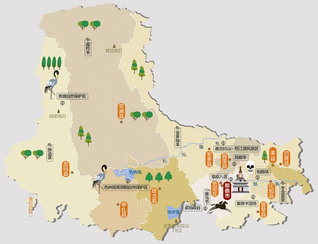 色尼區(qū) 面積16195平方千米,人口104490,政府駐那曲鎮(zhèn),下轄3個(gè)鎮(zhèn)、9個(gè)鄉(xiāng)